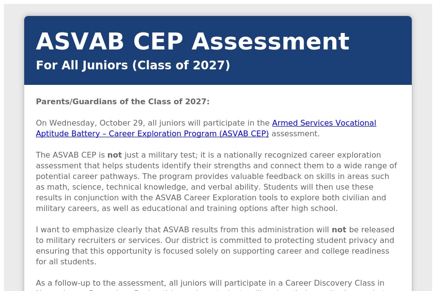 ASVAB CEP Assessment For All Juniors (Class of 2027) Parents/Guardians of the Class of 2027: On Wednesday, October 29, all juniors will participate in the Armed Services Voca. . .